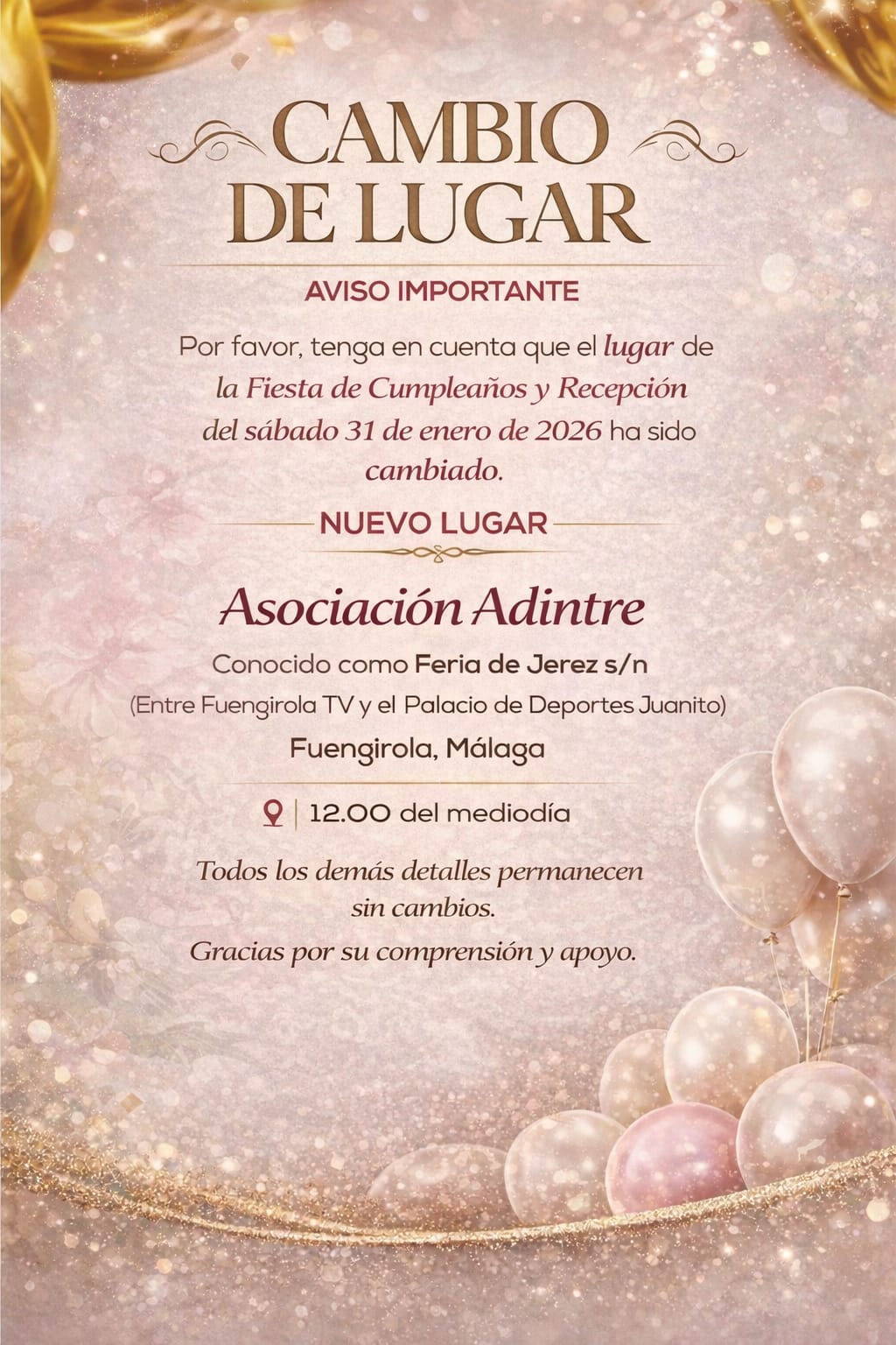 Cambio de lugar de la fiesta de Cumpleaños y Recepción del sábado 31 de enero de 2026